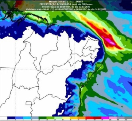 A Sala de Monitoramento da Secretaria de Estado do Meio Ambiente e Recursos Hídricos do Piauí (Semarh), em parceria com o Instituto Nacional de Meteorologia (Inmet), divulgou a previsão do tempo para esta semana, e o destaque é para o alerta de chuvas intensas no Litoral do estado, que podem ocorrer na terça e quarta-feira (08 e 09/07), de forma isolada. As chuvas devem atingir cerca de 22 municípios, com possibilidade de acumulados de até 50 mm, além de ventos intensos variando entre 40 e 60 km/h. A previsão do tempo é válida para o período de 07 a 14 de julho de 2025.