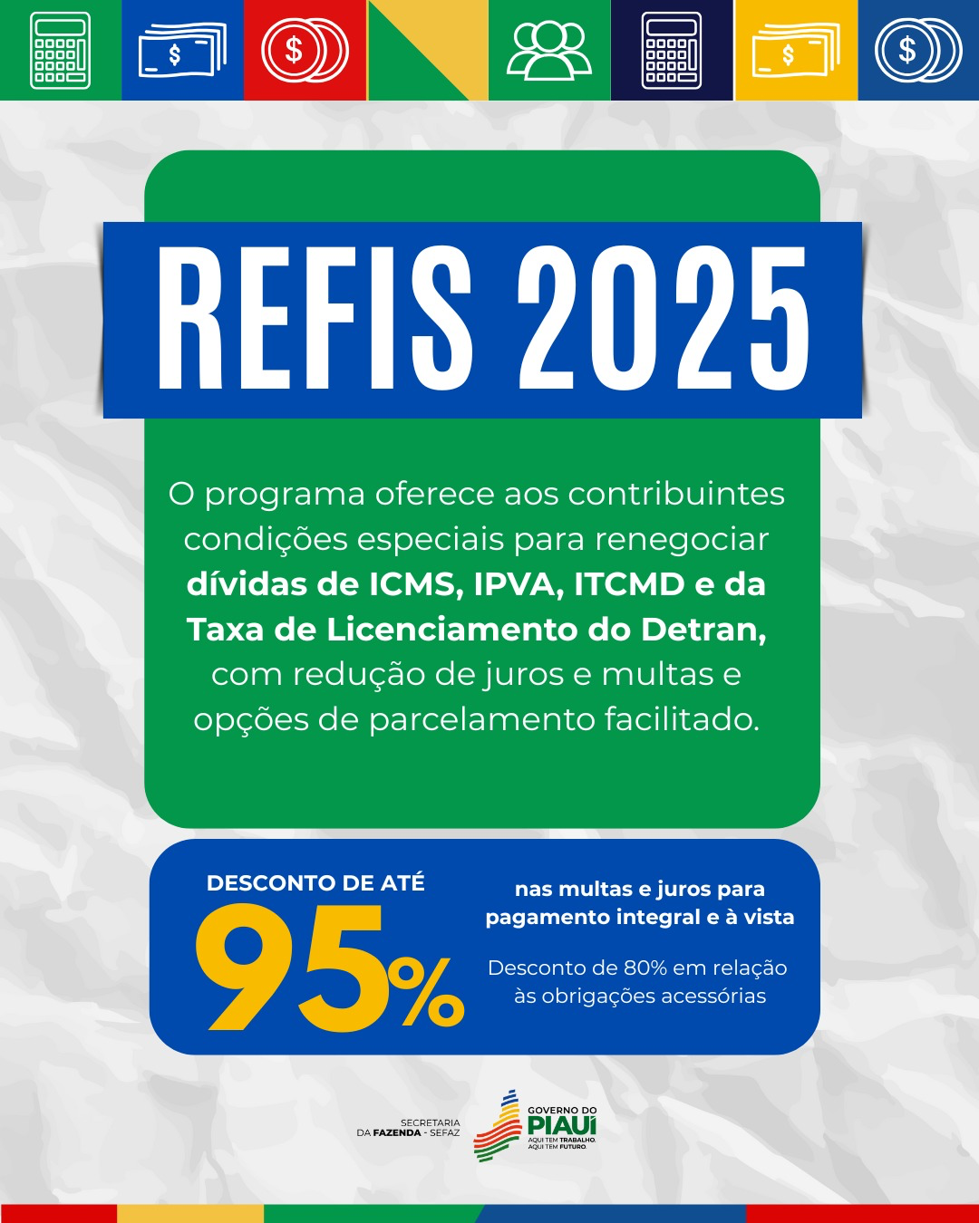 O Governo do Piauí, por meio da Secretaria da Fazenda (Sefaz), disponibiliza, a partir da próxima segunda-feira (10), o Programa de Recuperação de Créditos Tributários (Refis 2025), que prevê redução de até 95% de juros e multas para que os contribuintes possam negociar dívidas de ICMS, IPVA, ITCMD e da Taxa de Licenciamento do Detran. O prazo final para negociação desses débitos é até o próximo dia 15 de dezembro.