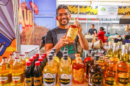 Félix Vieira, representante da Cajuespi, celebra o destaque para os produtos derivados do caju no estande da cooperativa. “A gente tem aqui desde a cajuína, até destilados com produtos do álcool do caju. Nós temos a cajuaça tradicional, temos ela envelhecida, temos o gin de caju, o whisky de caju e um dos produtos que é o mais procurado é o vinagre balsâmico do caju, que dá para colocar em saladas, carnes e queijos, é excelente em acompanhamentos. Está tendo muita procura, muitas vendas e tá sendo sensacional“, relata o produtor.