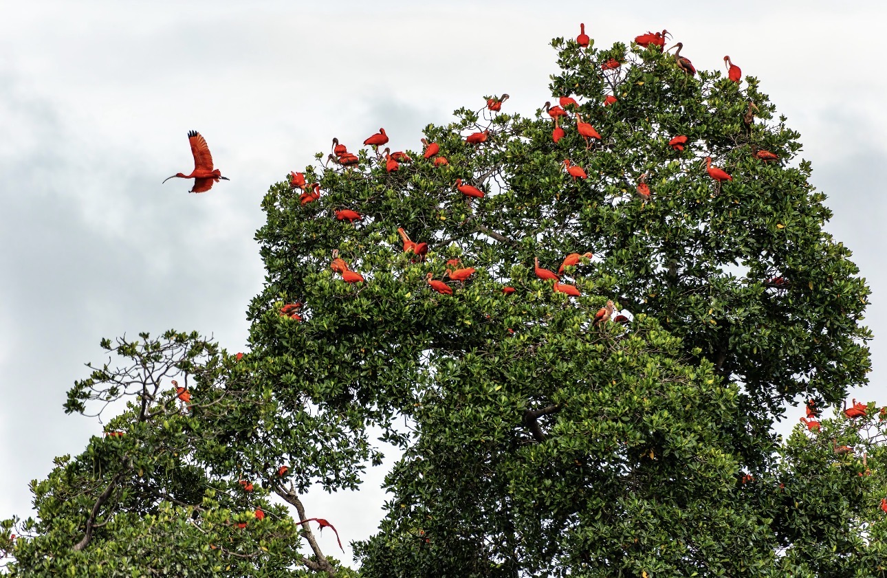 A coloração vibrante das penas do guará é resultado de sua alimentação rica em carotenoides, pigmentos encontrados em crustáceos como caranguejos e camarões típicos dos manguezais da região. Esse fenômeno natural pode ser observado em passeios de barco que partem do Porto dos Tatus, em Ilha Grande, a cerca de uma hora de Macapá.