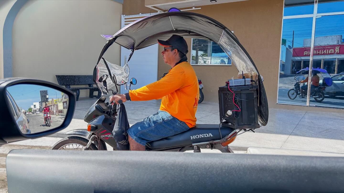 Fiz esta fotografia em Cocal, PI nessa segunda, 02 de fevereiro, às 9 horas, com o celular, de dentro do meu carro. O motociclista adaptou uma cobertura, que não protege quase nada, e um amplificador com propagandas comerciais previamente gravadas. Pode-se ver os detalhes, com um pouco de zoom na tela: a imagem refletida na vidraça da loja em frente e, no retrovisor, um torcedor do Flamengo que não se importou com a derrota do time ontem. A motocicleta e sua capacidade de adaptação à criatividade das pessoas.