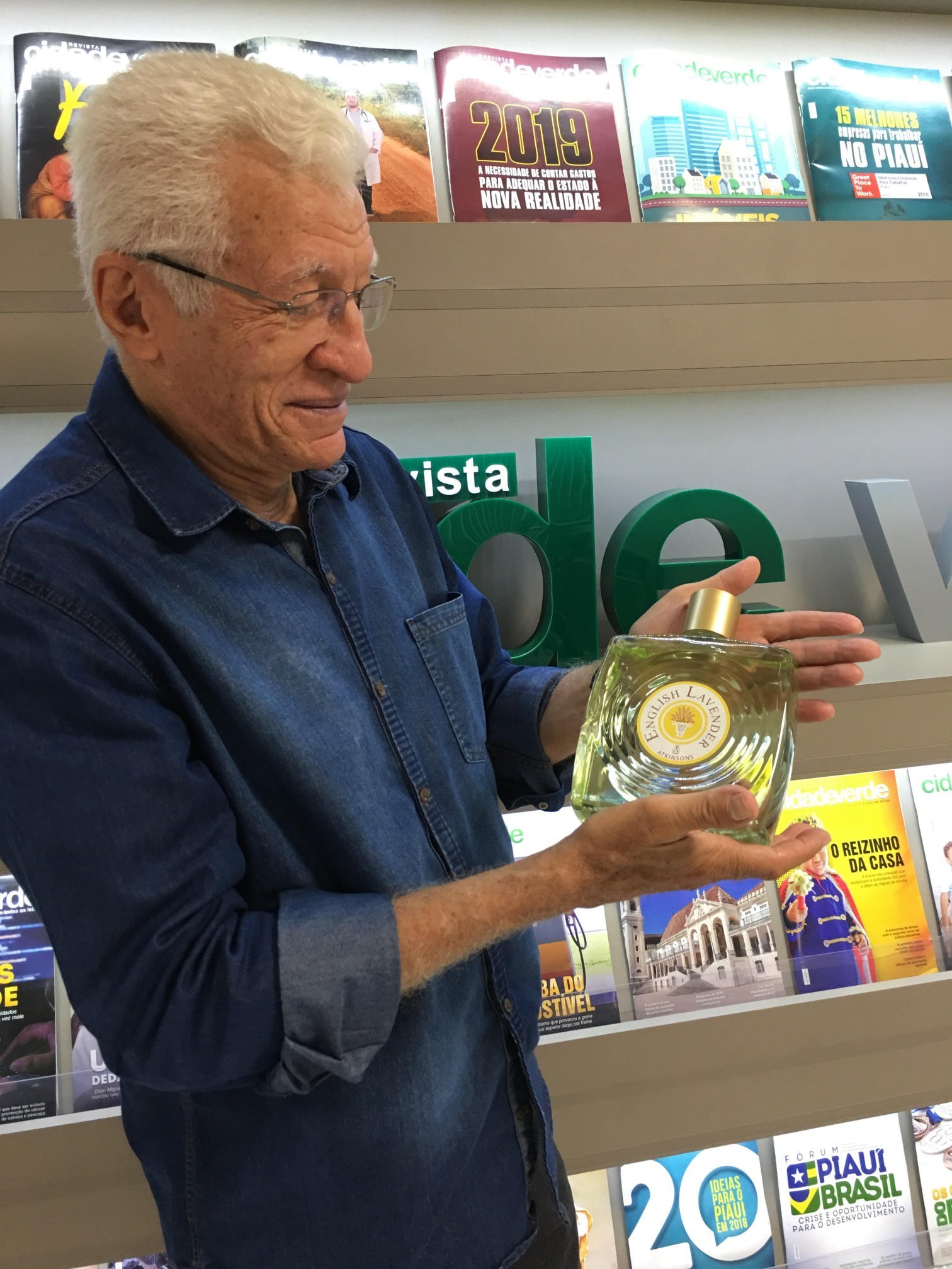 Um dia, sem aviso prévio, a lavanda saiu de circulação. Desesperado, berrei, protestei, pedi socorro. A primeira a atender-me foi a querida Luíza Miranda (encontrou um frasco numa gaveta: devia ser do Totó Barbosa). Nascia ali a “corrente benfazeja” das mulheres queridas. Integram-na, entre outras: Sisi Carvalho, Francisca Maria Mendes, Gilka Viana, Cláudia Brandão... Graças a esse gesto de carinho, estou abastecido de lavanda (de todas as procedências) por muitos anos. Assim, quando a “iniludível” bater-me à porta, há de encontrar-me vestido de azul, banhado de lavanda, pronto para os embates do além. Assim seja!