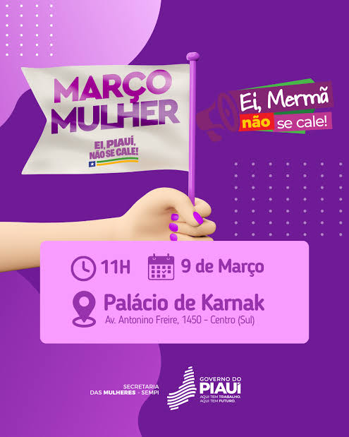 O Governo do Piauí, por meio da Secretaria das Mulheres (Sempi), realiza na próxima segunda-feira (9), às 11h, no Palácio de Karnak, a abertura oficial da campanha Março Mulher, com a presença do governador Rafael Fonteles. A programação inclui anúncios, entregas e parcerias voltadas à promoção da equidade de gênero, autonomia econômica e enfrentamento à violência contra as mulheres.