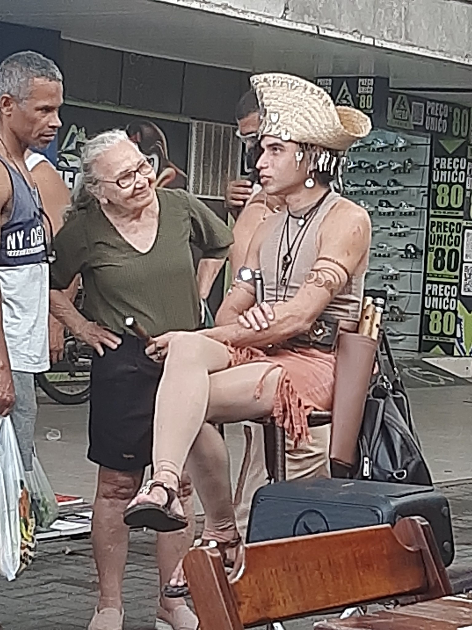 Uma artista de rua. A Jadi voz e pífano. De Teresina-Piauí. Um show com um som autêntico de raízes nordestina. As pessoas passam olham, algumas param por um momento e botam um trocadinho na cesta da artista. Vida de artista no Brasil não é fácil.