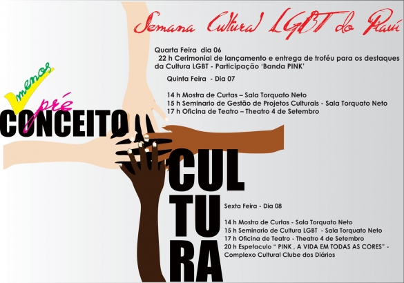 A Fundação de Cultura do Piauí (Fundac) realiza, de 6 a 8 de novembro, a I Semana Cultural LGBT do estado. As atividades serão realizadas no turno da tarde e noite, no Complexo do Theatro 4 de Setembro.