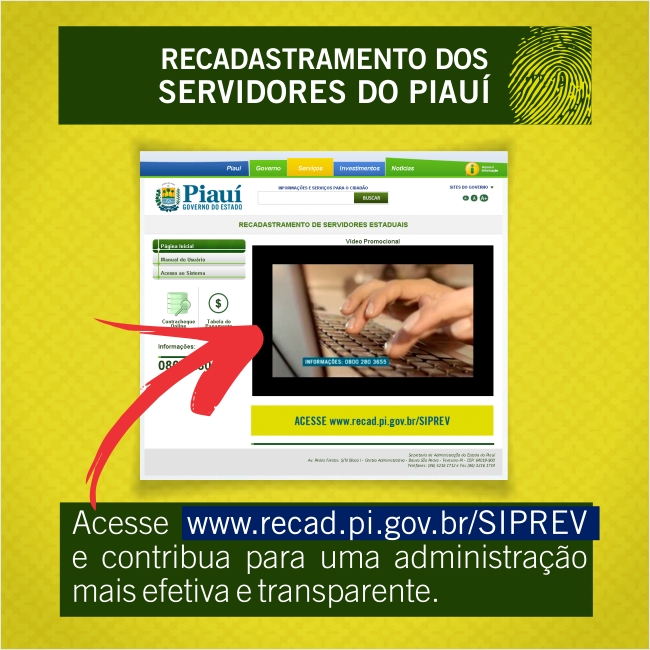 Até agora, quase 35 mil servidores públicos estaduais fizeram o recadastramento para atualização de dados cadastrais. Essa primeira etapa está sendo feita pela internet, por meio do endereço eletrônico: http://www.recad.pi.gov.br/SIPREV e termina no próximo dia 22 de agosto. O recadastramento está sendo coordenado pela Secretaria Estadual de Administração e Previdência-Seadprev, que também disponibiliza um canal direto para o servidor tirar qualquer dúvida. Basta telefonar para 08000 280 3655.